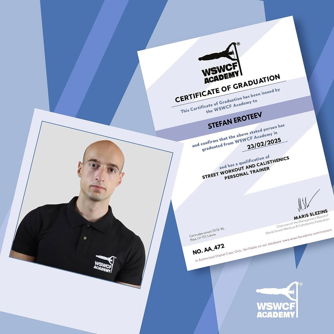 Certified by the World Street Workout & Calisthenics Federation, with over 10 years of experience in calisthenics, ensuring expert and trustworthy coaching.